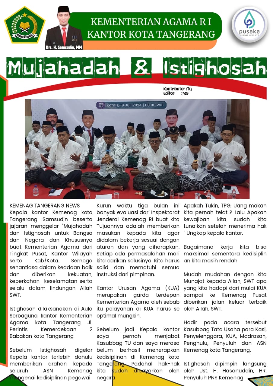 InfografisMujahadah dan IstighosahBy Taqdirullah19 Juli 2024047 TerpopulerSamsudin: Mari Bekerja Berdasarkan Filosofi Hewan 22 Januari 2024 SDM KUA Harus Profesional 31 Agustus 2023 28 Pegawai Baru Rasa Lama Sah Dilantik 28 Agustus 2023 Senam pagi Meningkatkan Produktivitas Pegawai Kankemenag Kota Tangerang 20 Oktober 2023 Taqdirullah Post Views: 11BagikanFacebookTwitterWhatsApp Artikulli paraprakAturan Barang Bawaan Jemaah Haji 1445 HArtikulli tjetërPemulangan Jemaah haji TerbaruPelantikan PPPK Tahap II Non Optimalisasi Formasi Tahun 2024 dan Pengukuhan Dewan Pengurus KORPRI Kemenag Kota Tangerang 23 Oktober 2025 Semarak Hari Santri 2025 di Kota Tangerang : Mengawal Indonesia Merdeka Menuju Peradaban Dunia 22 Oktober 2025 Kemenag Kota Tangerang Gelar Donor Darah dan Pemeriksaan Kesehatan Gratis Sambut Hari Santri Nasional 2025 21 Oktober 2025 Ribuan Siswa/i Antusias Ikuti Manasik Haji Se-Kota Tangerang di Lubana Sengkol Tangsel 16 Oktober 2025 Schedule Pelunasan BPIH Kanwil Kemenag Prov. Banten 6 Oktober 2025