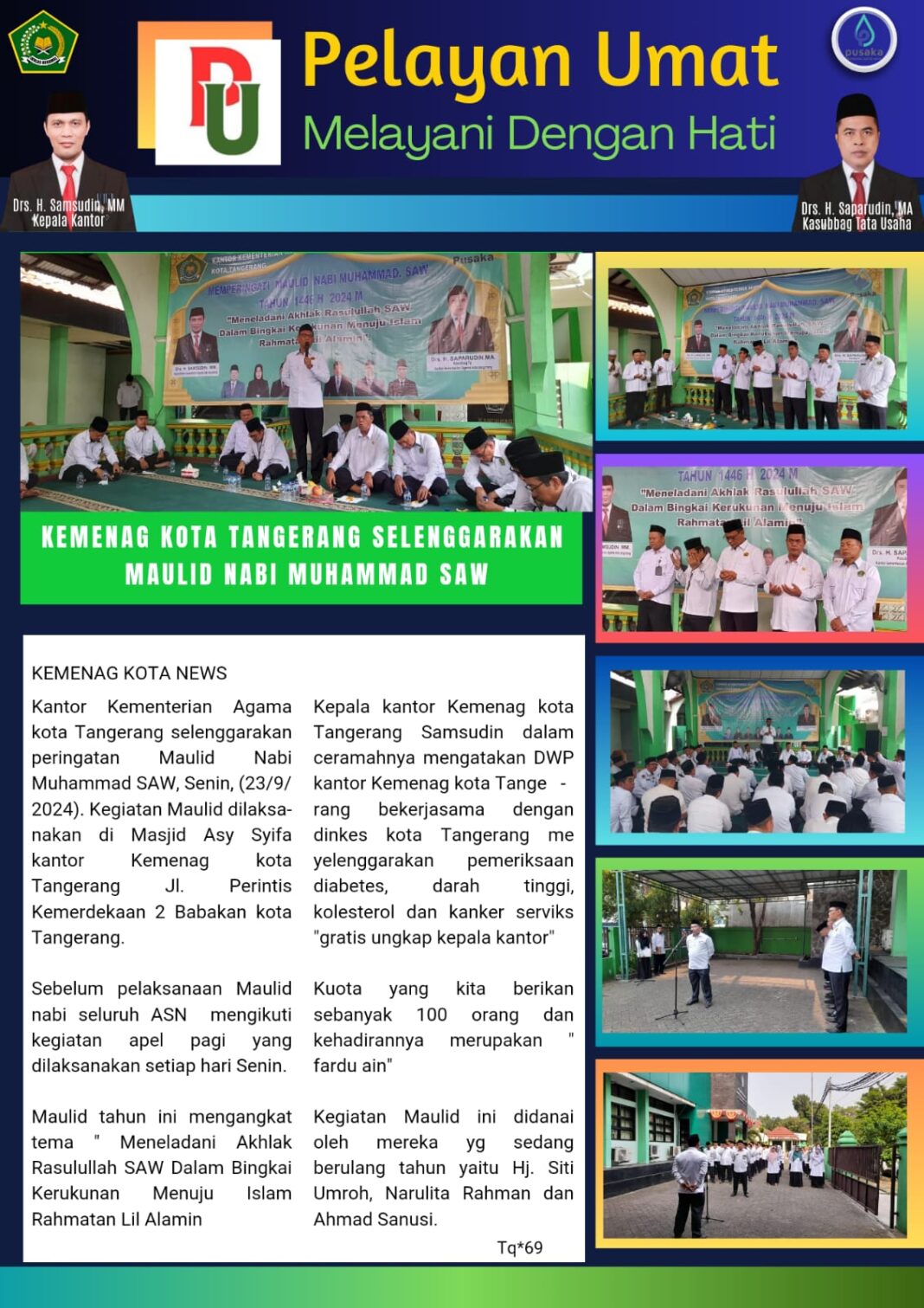 BeritaKemenag Kota Tangerang Selenggarakan Maulid Nabi Muhammad SAW 1446 H / 2024 MBy Taqdirullah23 September 2024051 Foto : Penyelenggaraan Maulid Nabi Muhammad SAW di Masjid Asy-Syifa Kemenag Kota TangerangTerpopulerSamsudin: Mari Bekerja Berdasarkan Filosofi Hewan 22 Januari 2024 SDM KUA Harus Profesional 31 Agustus 2023 28 Pegawai Baru Rasa Lama Sah Dilantik 28 Agustus 2023 Senam pagi Meningkatkan Produktivitas Pegawai Kankemenag Kota Tangerang 20 Oktober 2023 Taqdirullah Post Views: 9BagikanFacebookTwitterWhatsApp Artikulli paraprakMemperingati Maulid Nabi Muhammad SAW Tahun 1446 H / 2024 M. Kemenag Kota Tangerang Menggelar Kegiatan Maulid di Masjid Asy-Syifa Kementerian Agama Kota Tangerang, (Senin, 23/09/2024).Artikulli tjetërItjen Kemenag Monev Bantuan Inkubasi Bisnis Pesantren di Kota Tangerang TerbaruPelantikan PPPK Tahap II Non Optimalisasi Formasi Tahun 2024 dan Pengukuhan Dewan Pengurus KORPRI Kemenag Kota Tangerang 23 Oktober 2025 Semarak Hari Santri 2025 di Kota Tangerang : Mengawal Indonesia Merdeka Menuju Peradaban Dunia 22 Oktober 2025 Kemenag Kota Tangerang Gelar Donor Darah dan Pemeriksaan Kesehatan Gratis Sambut Hari Santri Nasional 2025 21 Oktober 2025 Ribuan Siswa/i Antusias Ikuti Manasik Haji Se-Kota Tangerang di Lubana Sengkol Tangsel 16 Oktober 2025 Schedule Pelunasan BPIH Kanwil Kemenag Prov. Banten 6 Oktober 2025
