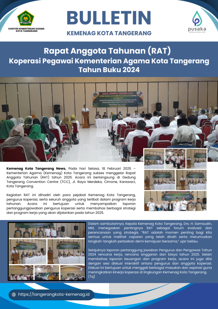 BeritaRapat Anggota Tahunan (RAT) Kemenag Kota Tangerang Tahun 2025 Sukses DigelarBy Taqdirullah18 Februari 20250107 Foto : Kegiatan RAT Pegawai Kantor Kemenag Kota TangerangTerpopulerSamsudin: Mari Bekerja Berdasarkan Filosofi Hewan 22 Januari 2024 SDM KUA Harus Profesional 31 Agustus 2023 28 Pegawai Baru Rasa Lama Sah Dilantik 28 Agustus 2023 Senam pagi Meningkatkan Produktivitas Pegawai Kankemenag Kota Tangerang 20 Oktober 2023 Taqdirullah Post Views: 15BagikanFacebookTwitterWhatsApp Artikulli paraprakTentang Biaya Penyelenggaraan Ibadah Haji Tahun 1446 H/2025 MArtikulli tjetërPELANTIKAN WALIKOTA DAN WAKIL WALIKOTA KOTA TANGERANG PERIODE 2025-2030 TerbaruPelantikan PPPK Tahap II Non Optimalisasi Formasi Tahun 2024 dan Pengukuhan Dewan Pengurus KORPRI Kemenag Kota Tangerang 23 Oktober 2025 Semarak Hari Santri 2025 di Kota Tangerang : Mengawal Indonesia Merdeka Menuju Peradaban Dunia 22 Oktober 2025 Kemenag Kota Tangerang Gelar Donor Darah dan Pemeriksaan Kesehatan Gratis Sambut Hari Santri Nasional 2025 21 Oktober 2025 Ribuan Siswa/i Antusias Ikuti Manasik Haji Se-Kota Tangerang di Lubana Sengkol Tangsel 16 Oktober 2025 Schedule Pelunasan BPIH Kanwil Kemenag Prov. Banten 6 Oktober 2025