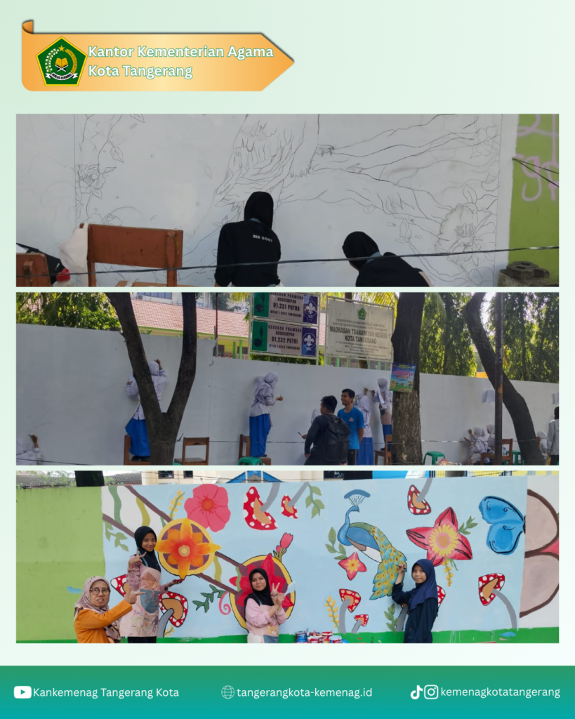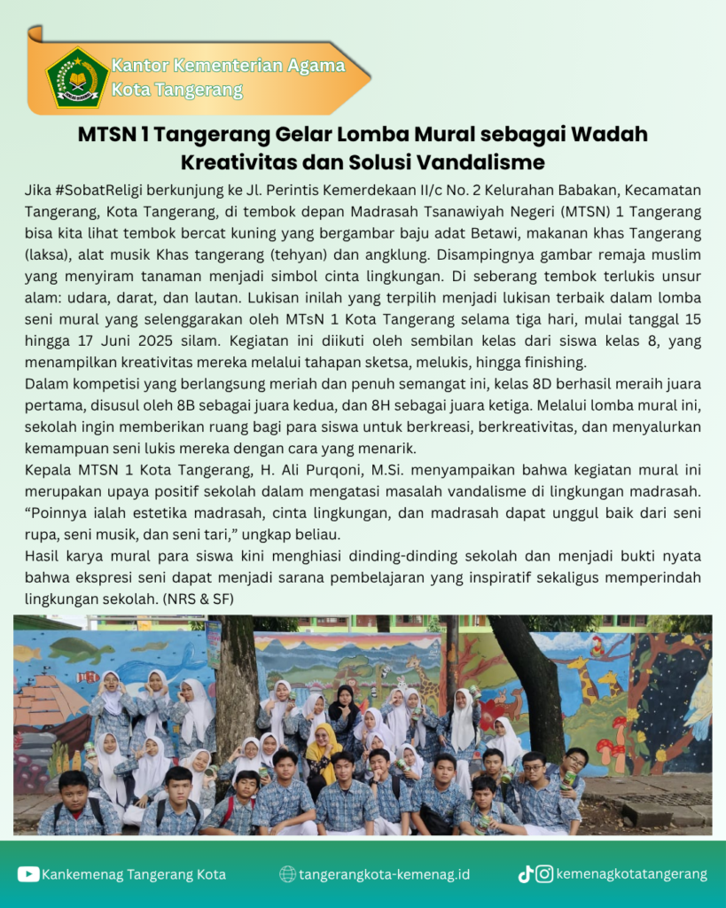 BeritaMTSN 1 Tangerang Gelar Lomba Mural sebagai Wadah Kreativitas dan Solusi VandalismeBy Sarah25 Juli 2025062 TerpopulerSamsudin: Mari Bekerja Berdasarkan Filosofi Hewan 22 Januari 2024 SDM KUA Harus Profesional 31 Agustus 2023 28 Pegawai Baru Rasa Lama Sah Dilantik 28 Agustus 2023 Senam pagi Meningkatkan Produktivitas Pegawai Kankemenag Kota Tangerang 20 Oktober 2023 Sarah Post Views: 11TagsCINTALINGKUNGANKREATIFMTSN1TANGERANGSENIMURALBagikanFacebookTwitterWhatsApp Artikulli paraprakApel Pagi dan Pembinaan ASN Kemenag Kota TangerangArtikulli tjetërMilad Emas 50 Tahun, “Setengah Abad Kiprah MUI” : Perkokoh Kebersamaan Ulama, Umat, dan Umara TerbaruPelantikan PPPK Tahap II Non Optimalisasi Formasi Tahun 2024 dan Pengukuhan Dewan Pengurus KORPRI Kemenag Kota Tangerang 23 Oktober 2025 Semarak Hari Santri 2025 di Kota Tangerang : Mengawal Indonesia Merdeka Menuju Peradaban Dunia 22 Oktober 2025 Kemenag Kota Tangerang Gelar Donor Darah dan Pemeriksaan Kesehatan Gratis Sambut Hari Santri Nasional 2025 21 Oktober 2025 Ribuan Siswa/i Antusias Ikuti Manasik Haji Se-Kota Tangerang di Lubana Sengkol Tangsel 16 Oktober 2025 Schedule Pelunasan BPIH Kanwil Kemenag Prov. Banten 6 Oktober 2025