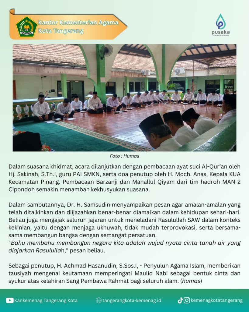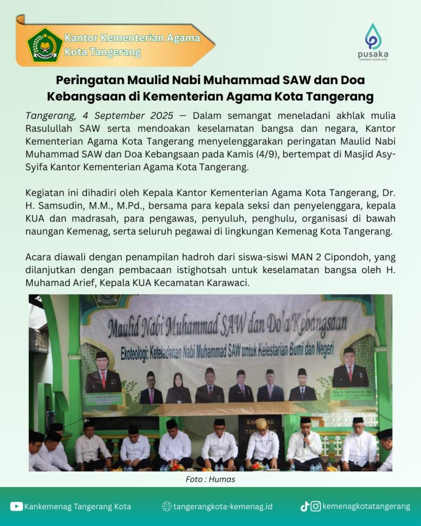 BeritaPeringatan Maulid Nabi Muhammad SAW. dan Doa Kebangsaan di Kemenag Kota TangerangBy Sarah5 September 2025037 TerpopulerSamsudin: Mari Bekerja Berdasarkan Filosofi Hewan 22 Januari 2024 SDM KUA Harus Profesional 31 Agustus 2023 28 Pegawai Baru Rasa Lama Sah Dilantik 28 Agustus 2023 Senam pagi Meningkatkan Produktivitas Pegawai Kankemenag Kota Tangerang 20 Oktober 2023 Sarah Post Views: 13BagikanFacebookTwitterWhatsApp Artikulli paraprakSelamat Memperingati Maulid Nabi Muhammad SAW.Artikulli tjetërSelamat dan Sukses TerbaruPelantikan PPPK Tahap II Non Optimalisasi Formasi Tahun 2024 dan Pengukuhan Dewan Pengurus KORPRI Kemenag Kota Tangerang 23 Oktober 2025 Semarak Hari Santri 2025 di Kota Tangerang : Mengawal Indonesia Merdeka Menuju Peradaban Dunia 22 Oktober 2025 Kemenag Kota Tangerang Gelar Donor Darah dan Pemeriksaan Kesehatan Gratis Sambut Hari Santri Nasional 2025 21 Oktober 2025 Ribuan Siswa/i Antusias Ikuti Manasik Haji Se-Kota Tangerang di Lubana Sengkol Tangsel 16 Oktober 2025 Schedule Pelunasan BPIH Kanwil Kemenag Prov. Banten 6 Oktober 2025