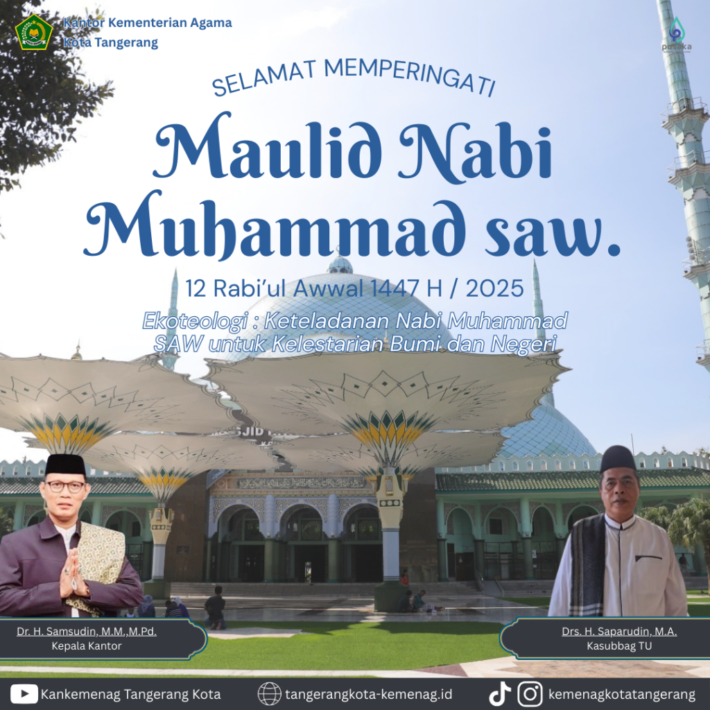 FotoSelamat Memperingati Maulid Nabi Muhammad SAW.By Sarah5 September 2025040 TerpopulerSamsudin: Mari Bekerja Berdasarkan Filosofi Hewan 22 Januari 2024 SDM KUA Harus Profesional 31 Agustus 2023 28 Pegawai Baru Rasa Lama Sah Dilantik 28 Agustus 2023 Senam pagi Meningkatkan Produktivitas Pegawai Kankemenag Kota Tangerang 20 Oktober 2023 Sarah Post Views: 13BagikanFacebookTwitterWhatsApp Artikulli paraprakJaga Diri, Jaga NegeriArtikulli tjetërPeringatan Maulid Nabi Muhammad SAW. dan Doa Kebangsaan di Kemenag Kota Tangerang TerbaruPelantikan PPPK Tahap II Non Optimalisasi Formasi Tahun 2024 dan Pengukuhan Dewan Pengurus KORPRI Kemenag Kota Tangerang 23 Oktober 2025 Semarak Hari Santri 2025 di Kota Tangerang : Mengawal Indonesia Merdeka Menuju Peradaban Dunia 22 Oktober 2025 Kemenag Kota Tangerang Gelar Donor Darah dan Pemeriksaan Kesehatan Gratis Sambut Hari Santri Nasional 2025 21 Oktober 2025 Ribuan Siswa/i Antusias Ikuti Manasik Haji Se-Kota Tangerang di Lubana Sengkol Tangsel 16 Oktober 2025 Schedule Pelunasan BPIH Kanwil Kemenag Prov. Banten 6 Oktober 2025