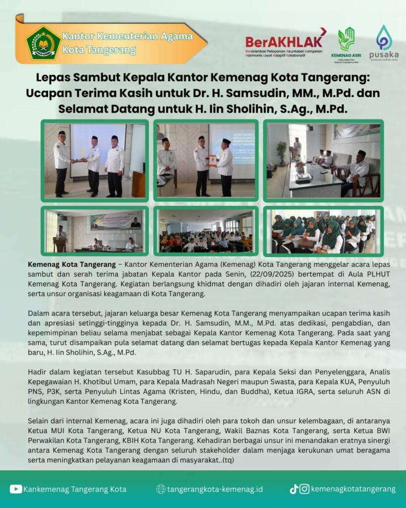 BeritaLepas Sambut dan Serah Terima Jabatan Kepala Kantor Kemenag Kota Tangerang.By Taqdirullah24 September 20250100 TerpopulerSamsudin: Mari Bekerja Berdasarkan Filosofi Hewan 22 Januari 2024 SDM KUA Harus Profesional 31 Agustus 2023 28 Pegawai Baru Rasa Lama Sah Dilantik 28 Agustus 2023 Senam pagi Meningkatkan Produktivitas Pegawai Kankemenag Kota Tangerang 20 Oktober 2023 Taqdirullah Post Views: 67BagikanFacebookTwitterWhatsApp Artikulli paraprakAudit Kinerja Itjen Pusat, Dorong Kemenag Kota Tangerang Semakin BaikArtikulli tjetërPembinaan Pegawai Melalui Apel Pagi: Meneguhkan Profesionalisme ASN TerbaruSemangat Kepahlawanan di Hari Pahlawan 2025 : Kemenag Kota Tangerang Gelar Apel Peringatan dan Pembinaan ASN 11 November 2025 Cara Deposit dan Withdraw di SBOBET88 Indonesia: Aman, Cepat, dan Praktis 8 November 2025 Kemenag Kota Tangerang Gelar Apel Pagi, Pengajian, dan Pembinaan Pegawai 3 November 2025 Kepala Kankemenag Kota Tangerang Buka Kegiatan PAI Fair 2025: Membangun Generasi Emas yang Berilmu, Berakhlak, dan Berdampak 2 November 2025 Pelantikan PPPK Tahap II Non Optimalisasi Formasi Tahun 2024 dan Pengukuhan Dewan Pengurus KORPRI Kemenag Kota Tangerang 23 Oktober 2025