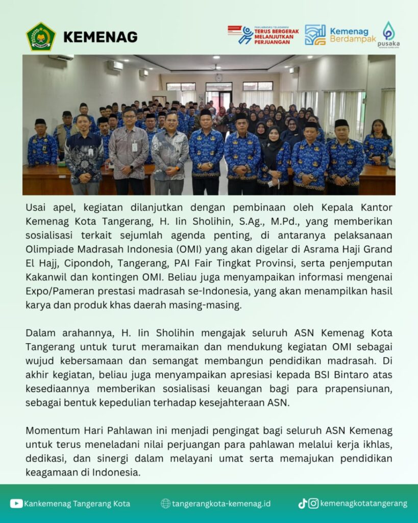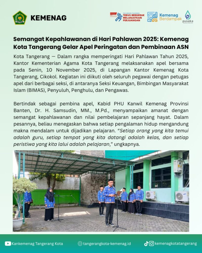 BeritaSemangat Kepahlawanan di Hari Pahlawan 2025 : Kemenag Kota Tangerang Gelar Apel Peringatan dan Pembinaan ASNBy Sarah11 November 2025034 TerpopulerSamsudin: Mari Bekerja Berdasarkan Filosofi Hewan 22 Januari 2024 SDM KUA Harus Profesional 31 Agustus 2023 28 Pegawai Baru Rasa Lama Sah Dilantik 28 Agustus 2023 Senam pagi Meningkatkan Produktivitas Pegawai Kankemenag Kota Tangerang 20 Oktober 2023 Sarah Post Views: 36Tags2025HARIPAHLAWANKEMENAGKOTATANGERANGBagikanFacebookTwitterWhatsApp Artikulli paraprakMari Kita Sukseskan OMIArtikulli tjetërSelamat dan Sukses 17 Agustus 2023 15 Agustus 2023 READ MORE 17 Agustus 2023 15 Agustus 2023 READ MORE Perayaan 17 Agustus 2023 14 Agustus 2023 READ MORE TerbaruKemenag Kota Tangerang Selenggarakan Seleksi Tahap I PPIH Arab Saudi & PPIH Kloter Tahun 1447H / 2026M 5 Desember 2025 Kemenag Kota Tangerang Gelar Seminar Pemberdayaan Ekonomi Umat Bagi Penyelenggara Zakat Wakaf 3 Desember 2025 Kasubbag TU Kemenag Kota Tangerang Hadiri Rapat Pembahasan Perpindahan Gereja dan Persiapan Nataru 2 Desember 2025 Apel Pagi Peringati HUT Ke – 54 Korpri: Wujud Dedikasi ASN untuk Indonesia Maju 2 Desember 2025 Kemenag Kota Tangerang Gelar Pelantikan PPPK Tahap II Optimalisasi dan Penyerahan SK Paruh Waktu 27 November 2025