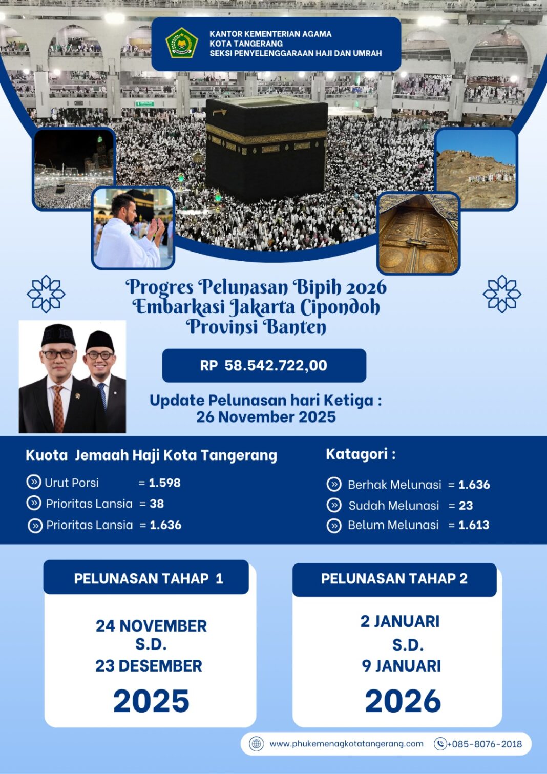 InfografisProgres Pelunasan BPIHBy Taqdirullah27 November 2025021 TerpopulerSamsudin: Mari Bekerja Berdasarkan Filosofi Hewan 22 Januari 2024 SDM KUA Harus Profesional 31 Agustus 2023 28 Pegawai Baru Rasa Lama Sah Dilantik 28 Agustus 2023 Senam pagi Meningkatkan Produktivitas Pegawai Kankemenag Kota Tangerang 20 Oktober 2023 Taqdirullah Post Views: 22BagikanFacebookTwitterWhatsApp Artikulli paraprakSelamat Hari Guru Nasional 2025Artikulli tjetërKemenag Kota Tangerang Gelar Pelantikan PPPK Tahap II Optimalisasi dan Penyerahan SK Paruh Waktu 17 Agustus 2023 15 Agustus 2023 READ MORE 17 Agustus 2023 15 Agustus 2023 READ MORE Perayaan 17 Agustus 2023 14 Agustus 2023 READ MORE TerbaruMeriah dan Bermakna: Kemenag Kota Tangerang Launching HAB Ke-80 dan Porseni KKM–MI 11 Desember 2025 Kementerian Agama Kota Tangerang Kuatkan Pembinaan Remaja 11 Desember 2025 Kick-off HAB Ke-80 di Kanwil Kemenag Banten: Teguhkan Semangat Kerukunan dan Sinergisitas 9 Desember 2025 Penguatan Mutu Pendidikan dan Perluasan Porseni Jadi Sorotan Apel Pagi Kemenag Kota Tangerang 8 Desember 2025 Kemenag Kota Tangerang Selenggarakan Seleksi Tahap I PPIH Arab Saudi & PPIH Kloter Tahun 1447H / 2026M 5 Desember 2025