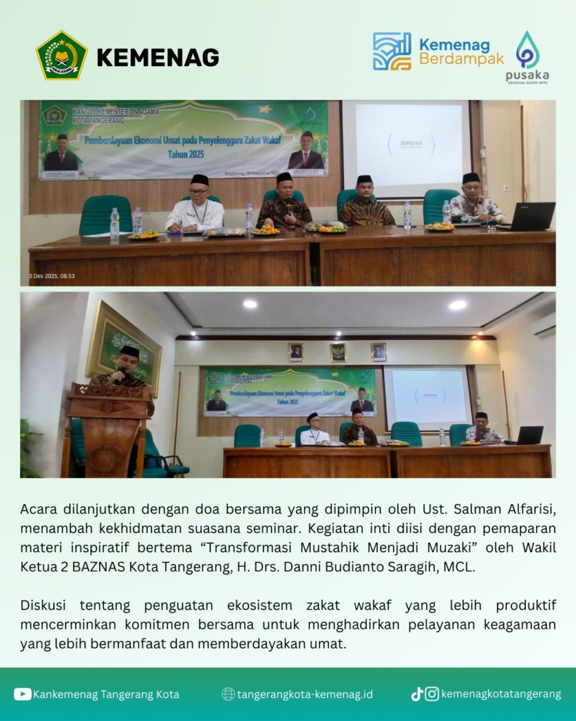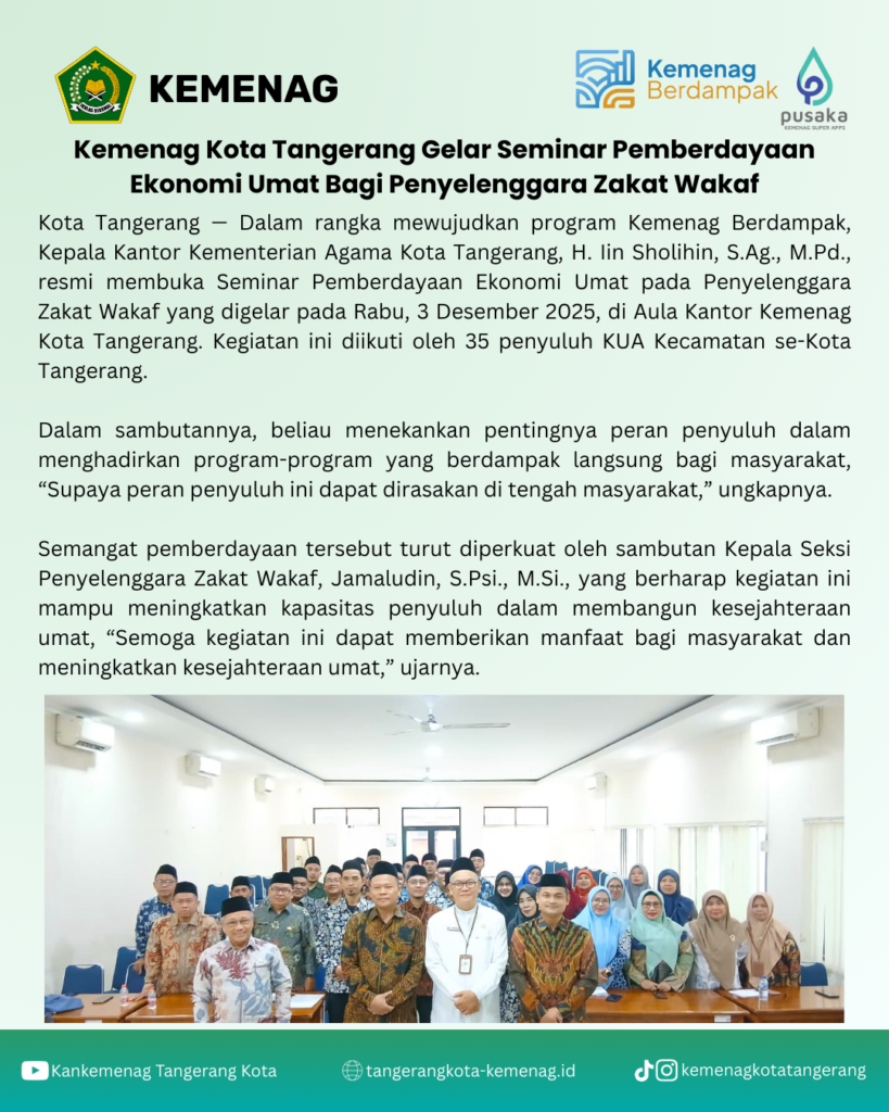 Zakat WaqafKemenag Kota Tangerang Gelar Seminar Pemberdayaan Ekonomi Umat Bagi Penyelenggara Zakat WakafBy Sarah3 Desember 2025019 TerpopulerSamsudin: Mari Bekerja Berdasarkan Filosofi Hewan 22 Januari 2024 SDM KUA Harus Profesional 31 Agustus 2023 28 Pegawai Baru Rasa Lama Sah Dilantik 28 Agustus 2023 Senam pagi Meningkatkan Produktivitas Pegawai Kankemenag Kota Tangerang 20 Oktober 2023 Sarah Post Views: 19BagikanFacebookTwitterWhatsApp Artikulli paraprakKasubbag TU Kemenag Kota Tangerang Hadiri Rapat Pembahasan Perpindahan Gereja dan Persiapan NataruArtikulli tjetërKemenag Kota Tangerang Selenggarakan Seleksi Tahap I PPIH Arab Saudi & PPIH Kloter Tahun 1447H / 2026M 17 Agustus 2023 15 Agustus 2023 READ MORE 17 Agustus 2023 15 Agustus 2023 READ MORE Perayaan 17 Agustus 2023 14 Agustus 2023 READ MORE TerbaruMeriah dan Bermakna: Kemenag Kota Tangerang Launching HAB Ke-80 dan Porseni KKM–MI 11 Desember 2025 Kementerian Agama Kota Tangerang Kuatkan Pembinaan Remaja 11 Desember 2025 Kick-off HAB Ke-80 di Kanwil Kemenag Banten: Teguhkan Semangat Kerukunan dan Sinergisitas 9 Desember 2025 Penguatan Mutu Pendidikan dan Perluasan Porseni Jadi Sorotan Apel Pagi Kemenag Kota Tangerang 8 Desember 2025 Kemenag Kota Tangerang Selenggarakan Seleksi Tahap I PPIH Arab Saudi & PPIH Kloter Tahun 1447H / 2026M 5 Desember 2025