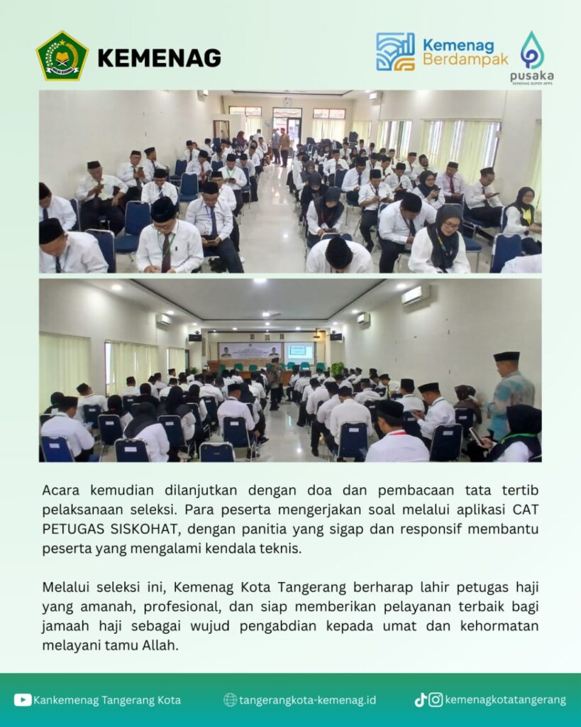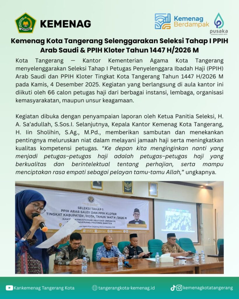 Haji & UmrohKemenag Kota Tangerang Selenggarakan Seleksi Tahap I PPIH Arab Saudi & PPIH Kloter Tahun 1447H / 2026MBy Sarah5 Desember 2025018 TerpopulerSamsudin: Mari Bekerja Berdasarkan Filosofi Hewan 22 Januari 2024 SDM KUA Harus Profesional 31 Agustus 2023 28 Pegawai Baru Rasa Lama Sah Dilantik 28 Agustus 2023 Senam pagi Meningkatkan Produktivitas Pegawai Kankemenag Kota Tangerang 20 Oktober 2023 Sarah Post Views: 19Tags1447H2026MKEMENAGPETUGASHAJIPPIHSELEKSIBagikanFacebookTwitterWhatsApp Artikulli paraprakKemenag Kota Tangerang Gelar Seminar Pemberdayaan Ekonomi Umat Bagi Penyelenggara Zakat WakafArtikulli tjetërPenguatan Mutu Pendidikan dan Perluasan Porseni Jadi Sorotan Apel Pagi Kemenag Kota Tangerang 17 Agustus 2023 15 Agustus 2023 READ MORE 17 Agustus 2023 15 Agustus 2023 READ MORE Perayaan 17 Agustus 2023 14 Agustus 2023 READ MORE TerbaruMeriah dan Bermakna: Kemenag Kota Tangerang Launching HAB Ke-80 dan Porseni KKM–MI 11 Desember 2025 Kementerian Agama Kota Tangerang Kuatkan Pembinaan Remaja 11 Desember 2025 Kick-off HAB Ke-80 di Kanwil Kemenag Banten: Teguhkan Semangat Kerukunan dan Sinergisitas 9 Desember 2025 Penguatan Mutu Pendidikan dan Perluasan Porseni Jadi Sorotan Apel Pagi Kemenag Kota Tangerang 8 Desember 2025 Kemenag Kota Tangerang Gelar Seminar Pemberdayaan Ekonomi Umat Bagi Penyelenggara Zakat Wakaf 3 Desember 2025