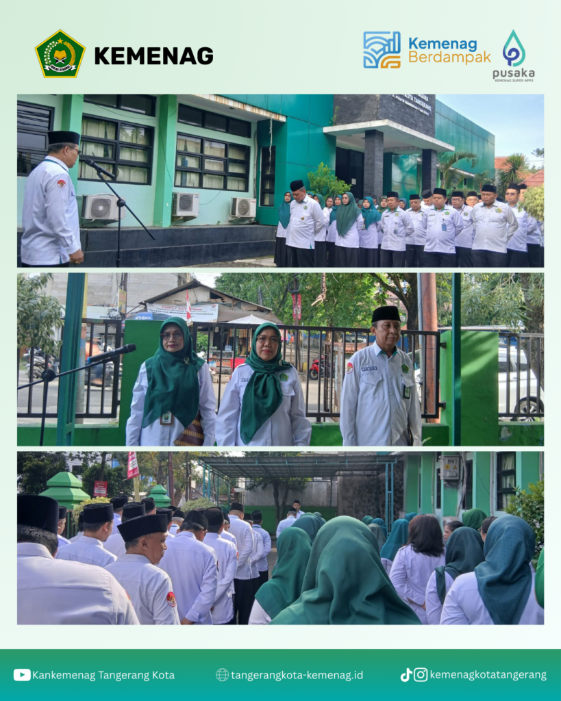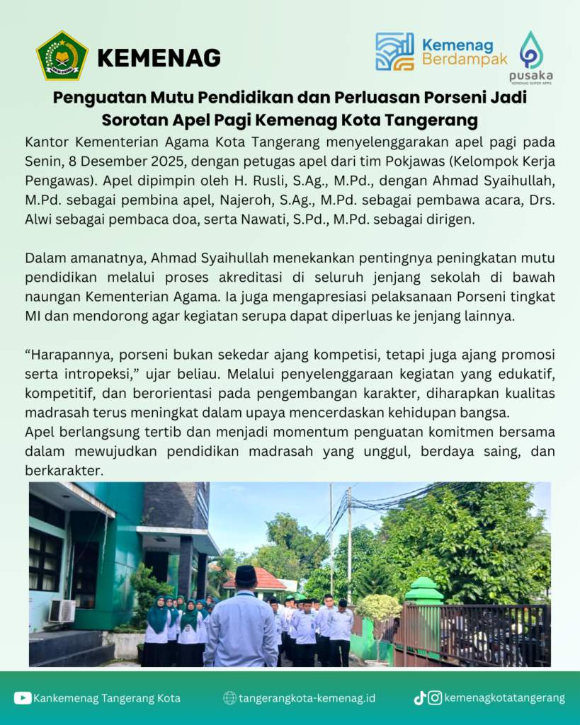 BeritaPenguatan Mutu Pendidikan dan Perluasan Porseni Jadi Sorotan Apel Pagi Kemenag Kota TangerangBy Sarah8 Desember 202508 TerpopulerSamsudin: Mari Bekerja Berdasarkan Filosofi Hewan 22 Januari 2024 SDM KUA Harus Profesional 31 Agustus 2023 28 Pegawai Baru Rasa Lama Sah Dilantik 28 Agustus 2023 Senam pagi Meningkatkan Produktivitas Pegawai Kankemenag Kota Tangerang 20 Oktober 2023 Sarah Post Views: 7TagsAPELKEMENAGKOTATANGERANGPAGIBagikanFacebookTwitterWhatsApp Artikulli paraprakKemenag Kota Tangerang Selenggarakan Seleksi Tahap I PPIH Arab Saudi & PPIH Kloter Tahun 1447H / 2026MArtikulli tjetërKick-off HAB Ke-80 di Kanwil Kemenag Banten: Teguhkan Semangat Kerukunan dan Sinergisitas 17 Agustus 2023 15 Agustus 2023 READ MORE 17 Agustus 2023 15 Agustus 2023 READ MORE Perayaan 17 Agustus 2023 14 Agustus 2023 READ MORE TerbaruMeriah dan Bermakna: Kemenag Kota Tangerang Launching HAB Ke-80 dan Porseni KKM–MI 11 Desember 2025 Kementerian Agama Kota Tangerang Kuatkan Pembinaan Remaja 11 Desember 2025 Kick-off HAB Ke-80 di Kanwil Kemenag Banten: Teguhkan Semangat Kerukunan dan Sinergisitas 9 Desember 2025 Kemenag Kota Tangerang Selenggarakan Seleksi Tahap I PPIH Arab Saudi & PPIH Kloter Tahun 1447H / 2026M 5 Desember 2025 Kemenag Kota Tangerang Gelar Seminar Pemberdayaan Ekonomi Umat Bagi Penyelenggara Zakat Wakaf 3 Desember 2025