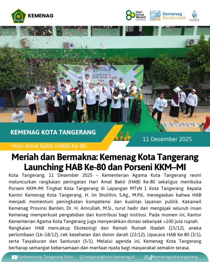 Kota Tangerang, 11 Desember 2025 – Kementerian Agama Kota Tangerang resmi meluncurkan rangkaian peringatan Hari Amal Bhakti (HAB) Ke-80 Kementerian Agama RI, yang dirangkaikan dengan Opening Ceremony Porseni KKM–MI Tingkat Kota Tangerang, pada Kamis (11/12) di Lapangan MTsN 1 Kota Tangerang. Kegiatan ini menjadi awal dari berbagai agenda perayaan yang meneguhkan semangat pengabdian, sinergi, dan peningkatan layanan publik di lingkungan Kemenag Kota Tangerang.