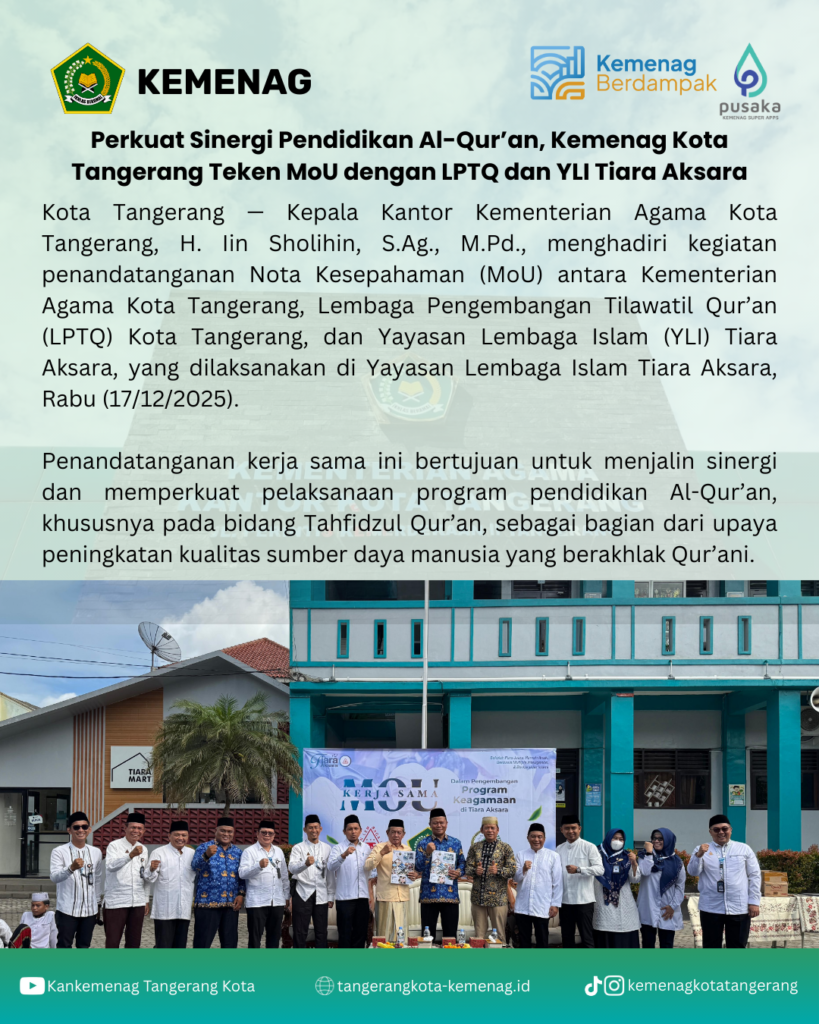 BeritaPerkuat Sinergi Pendidikan Al-Qur’an, Kemenag Kota Tangerang Teken MoU dengan LPTQ dan YLI Tiara AksaraBy Taqdirullah19 Desember 2025042 TerpopulerSamsudin: Mari Bekerja Berdasarkan Filosofi Hewan 22 Januari 2024 SDM KUA Harus Profesional 31 Agustus 2023 28 Pegawai Baru Rasa Lama Sah Dilantik 28 Agustus 2023 Senam pagi Meningkatkan Produktivitas Pegawai Kankemenag Kota Tangerang 20 Oktober 2023 Taqdirullah Post Views: 44BagikanFacebookTwitterWhatsApp Artikulli paraprakRakerda BWI Kota Tangerang Dorong Optimalisasi Wakaf Untuk Kesejahteraan MasyarakatArtikulli tjetërMewujudkan Pendidikan Unggul dan Berkelanjutan Melalui Diklat PKB Kurikulum Berbasis Cinta dan Ekoteologi 17 Agustus 2023 15 Agustus 2023 READ MORE 17 Agustus 2023 15 Agustus 2023 READ MORE Perayaan 17 Agustus 2023 14 Agustus 2023 READ MORE TerbaruHAB Ke-80 : Upacara Khidmat Kemenag Kota Tangerang Perkokoh Sinergi dan Kerukunan 5 Januari 2026 Cuplikan Kegiatan Hari Amal Bakti (HAB) Ke-80 tingkat Kemenag Kota Tangerang 3 Januari 2026 Mewujudkan Pendidikan Unggul dan Berkelanjutan Melalui Diklat PKB Kurikulum Berbasis Cinta dan Ekoteologi 30 Desember 2025 Rakerda BWI Kota Tangerang Dorong Optimalisasi Wakaf Untuk Kesejahteraan Masyarakat 19 Desember 2025 Meriahkan HAB Ke-80, Kemenag Kota Tangerang Gelar Perlombaan Tenis Meja 17 Desember 2025