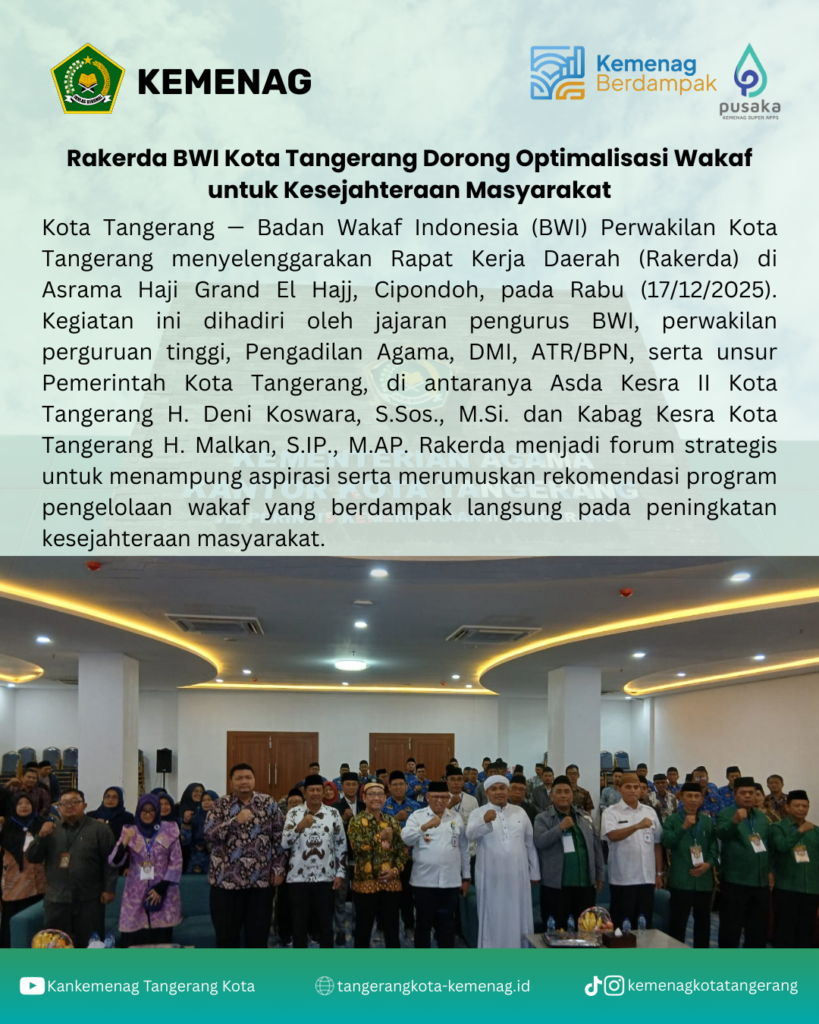 BeritaRakerda BWI Kota Tangerang Dorong Optimalisasi Wakaf Untuk Kesejahteraan MasyarakatBy Taqdirullah19 Desember 2025070 TerpopulerSamsudin: Mari Bekerja Berdasarkan Filosofi Hewan 22 Januari 2024 SDM KUA Harus Profesional 31 Agustus 2023 28 Pegawai Baru Rasa Lama Sah Dilantik 28 Agustus 2023 Senam pagi Meningkatkan Produktivitas Pegawai Kankemenag Kota Tangerang 20 Oktober 2023 Taqdirullah Post Views: 70BagikanFacebookTwitterWhatsApp Artikulli paraprakMeriahkan HAB Ke-80, Kemenag Kota Tangerang Gelar Perlombaan Tenis MejaArtikulli tjetërPerkuat Sinergi Pendidikan Al-Qur’an, Kemenag Kota Tangerang Teken MoU dengan LPTQ dan YLI Tiara Aksara 17 Agustus 2023 15 Agustus 2023 READ MORE 17 Agustus 2023 15 Agustus 2023 READ MORE Perayaan 17 Agustus 2023 14 Agustus 2023 READ MORE TerbaruRAT Koperasi Karyawan Kemenag Kota Tangerang Tahun Buku 2025 Teguhkan Transparansi dan Semangat Kekeluargaan 17 Februari 2026 Peringatan Isra Mi’raj dan Tarhib Ramadhan, Kemenag Kota Tangerang Perkuat Spirit Ibadah dan Penyuluhan Umat 11 Februari 2026 Kemenag Kota Tangerang Teguhkan Komitmen Peningkatan Mutu Guru Madrasah 4 Februari 2026 Kemenag Kota Tangerang Salurkan Santunan HAB Ke-80, Prioritaskan Siswa Madrasah 3 Februari 2026 Kepala Kankemenag Kota Tangerang Soroti Keberpihakan Kemenag pada Guru Madrasah di Rakerda II PD IGRA 3 Februari 2026