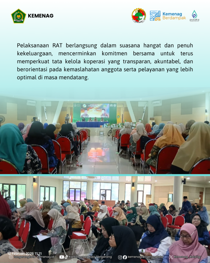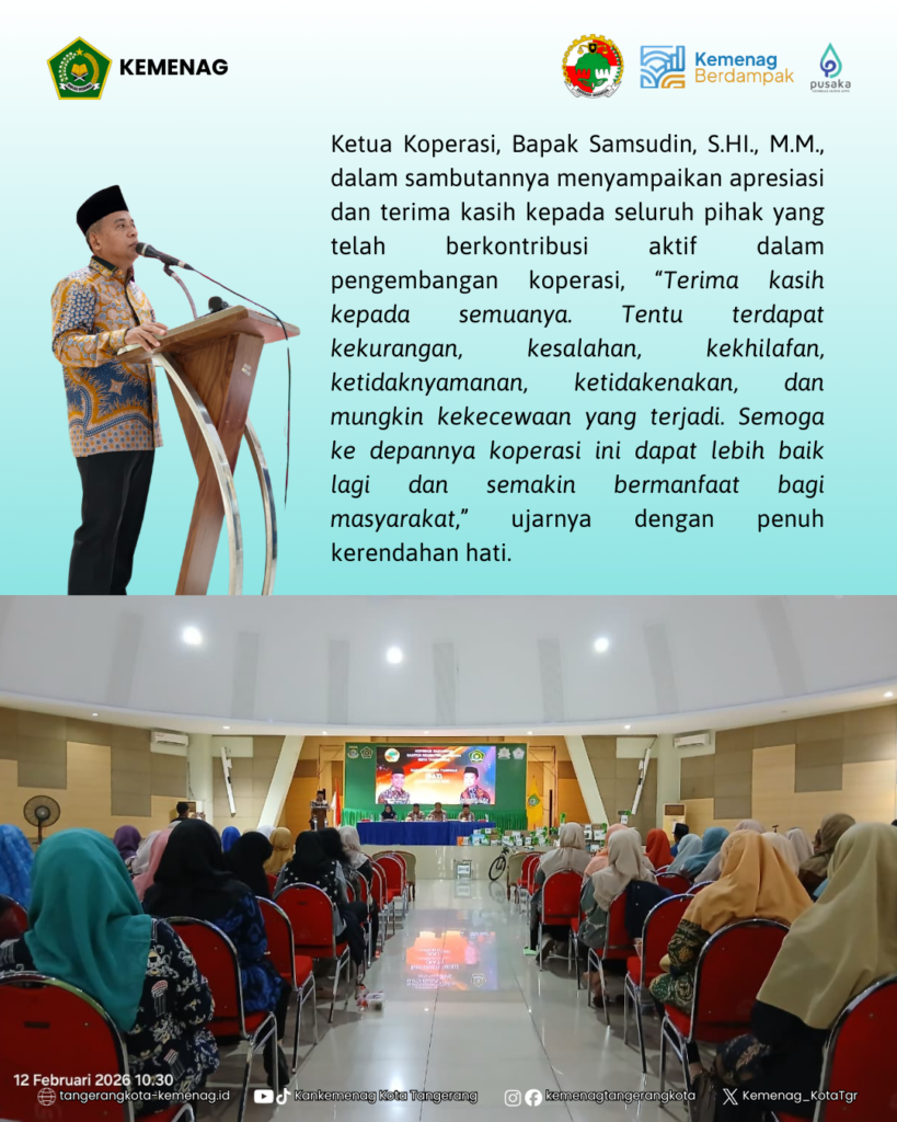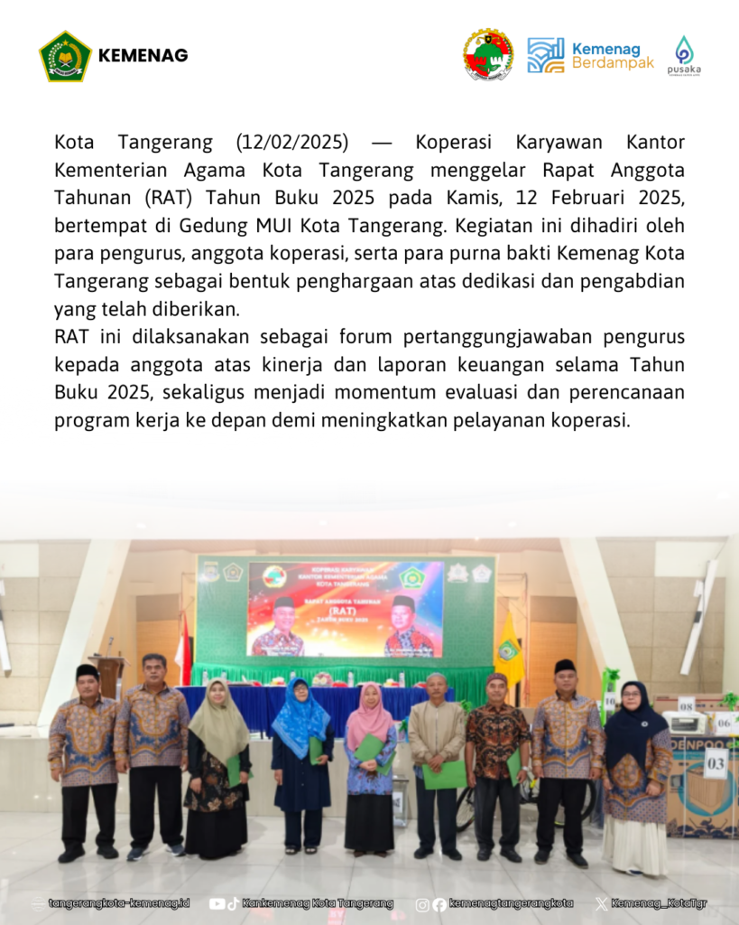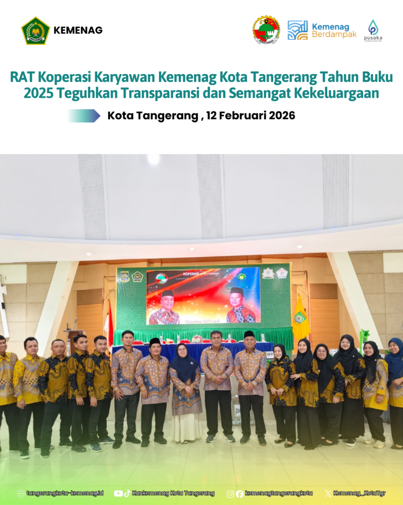 BeritaRAT Koperasi Karyawan Kemenag Kota Tangerang Tahun Buku 2025 Teguhkan Transparansi dan Semangat KekeluargaanBy Sarah17 Februari 202602 TerpopulerSamsudin: Mari Bekerja Berdasarkan Filosofi Hewan 22 Januari 2024 SDM KUA Harus Profesional 31 Agustus 2023 28 Pegawai Baru Rasa Lama Sah Dilantik 28 Agustus 2023 Senam pagi Meningkatkan Produktivitas Pegawai Kankemenag Kota Tangerang 20 Oktober 2023 Sarah Post Views: 2BagikanFacebookTwitterWhatsApp Artikulli paraprakSelamat dan SuksesArtikulli tjetërSelamat Tahun Baru Imlek 17 Agustus 2023 15 Agustus 2023 READ MORE 17 Agustus 2023 15 Agustus 2023 READ MORE Perayaan 17 Agustus 2023 14 Agustus 2023 READ MORE TerbaruPeringatan Isra Mi’raj dan Tarhib Ramadhan, Kemenag Kota Tangerang Perkuat Spirit Ibadah dan Penyuluhan Umat 11 Februari 2026 Kemenag Kota Tangerang Teguhkan Komitmen Peningkatan Mutu Guru Madrasah 4 Februari 2026 Kemenag Kota Tangerang Salurkan Santunan HAB Ke-80, Prioritaskan Siswa Madrasah 3 Februari 2026 Kepala Kankemenag Kota Tangerang Soroti Keberpihakan Kemenag pada Guru Madrasah di Rakerda II PD IGRA 3 Februari 2026 Kemenag Kota Tangerang Jalin Kerja Sama Pembinaan dengan Lapas Perempuan Kelas IIA 28 Januari 2026