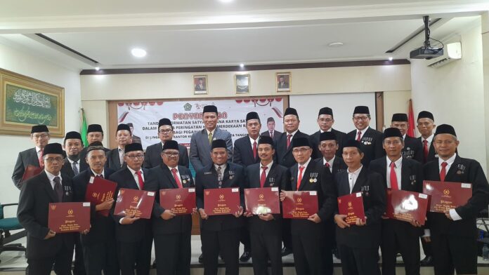Foto Bersama Kepala Kantor Kemenag Kota Tangerang Setelah Penyematan Satyalancana Karya Satya. Bagi Pegawai Negeri Sipil di Lingkungan Kantor Kemenag Kota Tangerang, dalam rangka peringatan HUT Kemerdekaan RI Ke-79 Tahun 2024.