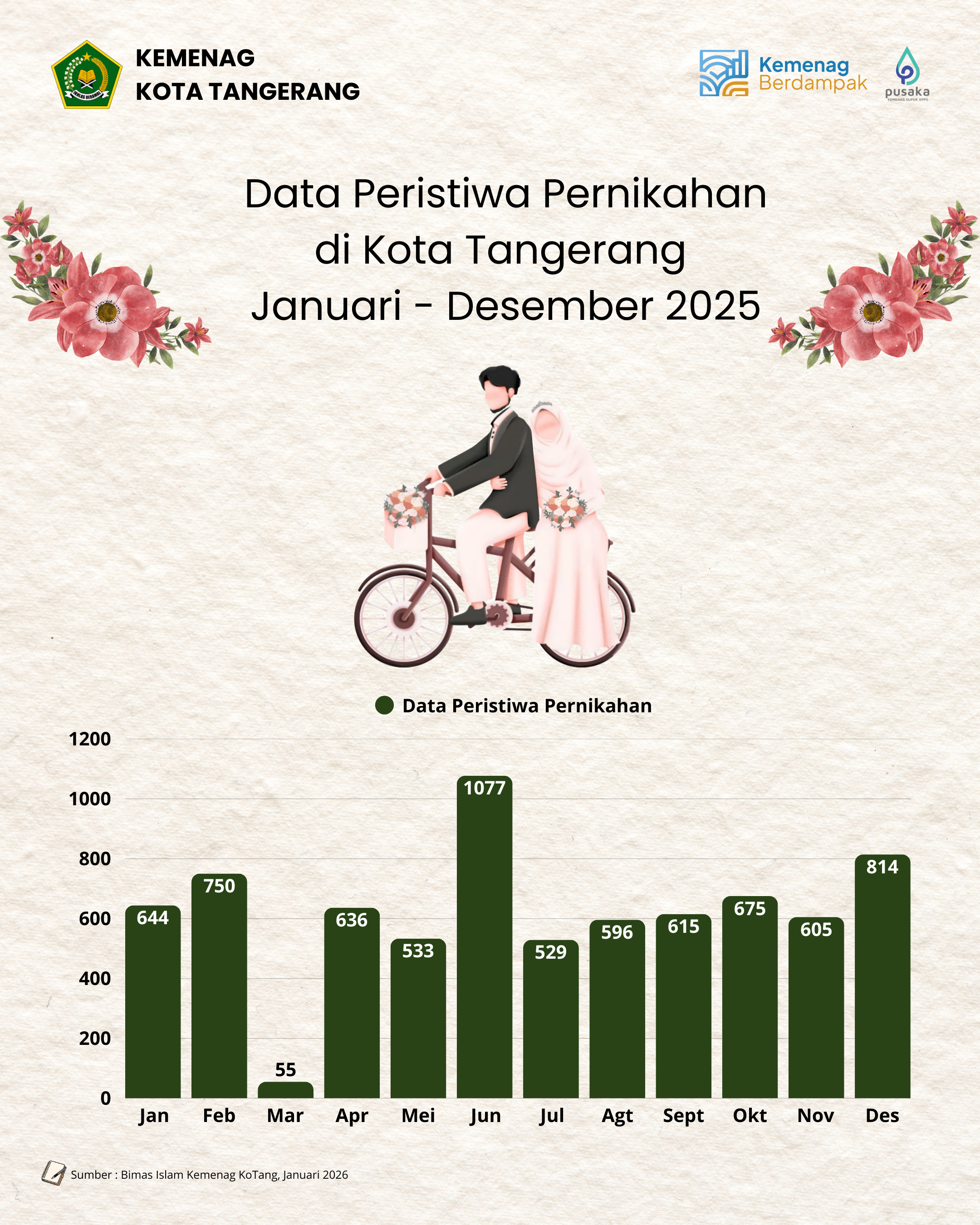 Sepanjang Januari – Desember 2025, jumlah peristiwa nikah di Kota Tangerang menunjukkan pola yang cukup menarik. Bulan Juni menjadi peak season dengan 1.077 pasangan menikah, sementara bulan Maret menjadi yang paling sedikit dengan hanya 55 pasangan.Lonjakan pada bulan Juni kemungkinan dipengaruhi oleh beberapa faktor, seperti momen libur sekolah, cuaca yang relatif mendukung, serta kedekatan dengan musim pernikahan pertengahan tahun yang sering dipilih banyak pasangan. Sementara itu, rendahnya angka di bulan Maret bisa berkaitan dengan bulan puasa di tahun 2025, serta belum masuk musim favorit untuk menggelar resepsi.